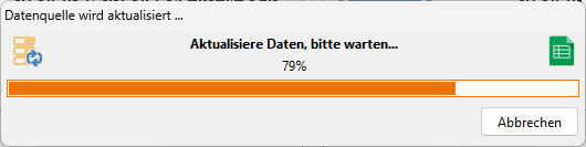 Falls Sie Daten aktualisieren, wenn diese Datei geladen oder gedruckt wird (auf der Registerkarte Datenquelle des Dialogfelds Set Eigenschaften), markiert haben wird die Datenaktualisierung automatisch unmittelbar nach dem Laden der Datei und vor dem Drucken oder Exportieren durchgeführt. Ein Fortschrittsdialogfeld wird angezeigt, und es ist möglich den Aktualisierungsvorgang bei Bedarf abzubrechen.