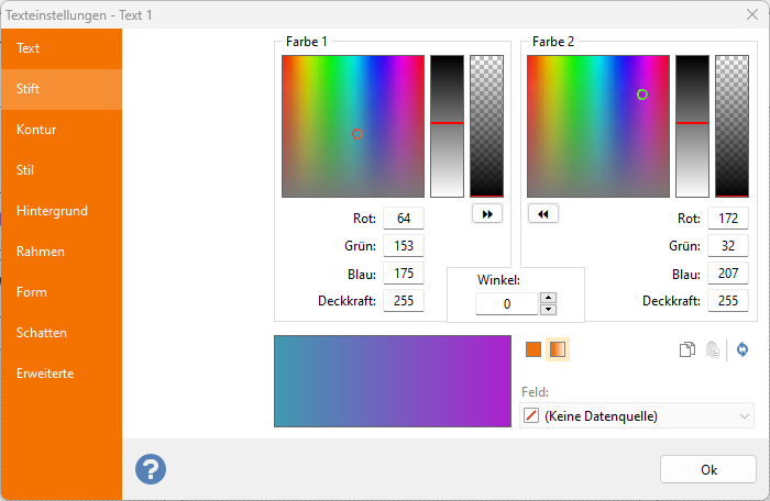 Farbverlauf: In diesem Arbeitsmodus ist das Dialogfeld in zwei identische Abschnitte unterteilt. Sie können jeweils eine der beiden Farben definieren, die zu dem gewünschten Fading-Effekt kombiniert werden. Im oberen Teil jedes Abschnitts finden Sie den Farbauswahlbereich, die Helligkeitsleiste und die Deckkraftleiste, mit denen Sie einen Deckkraftwert zwischen 0 und 255 definieren können (wobei 0 vollständig transparent und 255 vollständig undurchsichtig ist). In jedem der beiden Abschnitte werden die RGB-Textfelder und das Deckkraft-Textfeld angezeigt. Sie können eine Farbdefinition in die andere kopieren, indem Sie auf die Schaltfläche « und » klicken. Im unteren Bereich des Dialogfelds wird der Vorschaubereich mit der ausgewählten Kombination angezeigt. Auf der rechten Seite befinden sich die Steuerelemente, mit denen Sie den Fading-Winkel definieren können. Auch hier können Sie manuell einen Wert eingeben (zwischen 0 und 359,9 Grad) oder die Bildlaufleiste verwenden.