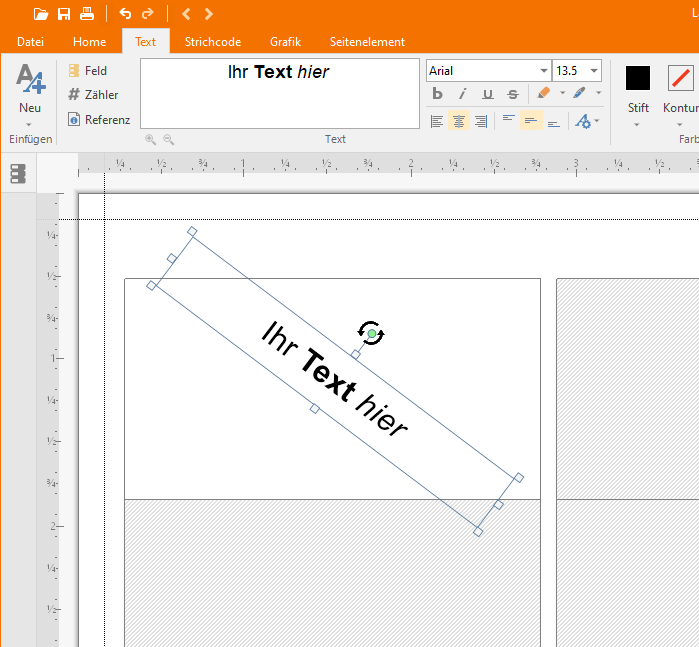 Alle auf der Seite platzierten Elemente, sowohl Etikettenelemente als auch Seitenelemente, können frei um einen Winkel zwischen 0 ° und 359,9 ° Grad gedreht werden.