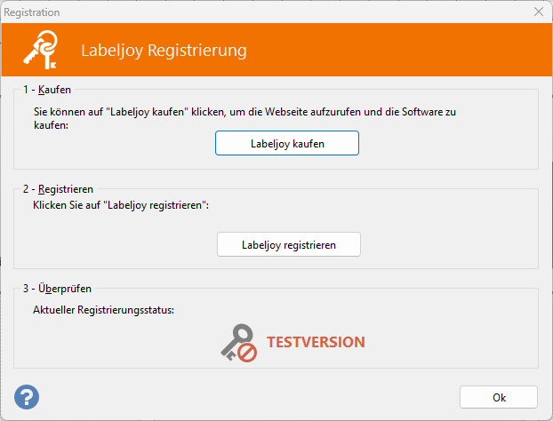 Um Labeljoy zu registrieren, folgen Sie diesen einfachen 3 Schritten: verbinden Sie sich mit der Website von Labeljoy und kaufen Sie einen Registrierungscode tragen Sie diesen in das Registrierungsdialogfeld ein auf das über das Registrierungs-Untermenü im Hilfe-Menü zugegriffen werden kann und überprüfen Sie danach den erfolgreichen Abschluss des Registrierungsprozesses.