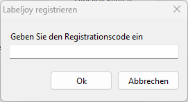 Sobald Sie Ihren individuellen Registrierungscode erhalten haben, klicken Sie im zweiten Rahmen auf die Schaltfläche Labeljoy registrieren. In einem Popup-Fenster können Sie den gerade empfangenen Code eingeben.
