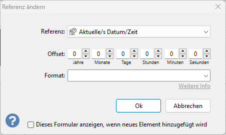 - Aktuelles Datum / Uhrzeit: aktuelles Datum und Uhrzeit. Verwenden Sie das Kombinationsfeld Format, um die Darstellung anzupassen.