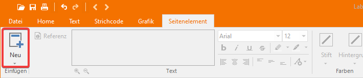 Um ein neues Seitenelement hinzuzufügen, müssen Sie den Seitenelement-Einfügemodus starten, indem Sie auf die entsprechende Schaltfläche auf der Registerkarte Seitenelement klicken und die Maus verwenden, um den neuen Textbereich auf ein Etikett zu zeichnen.
