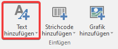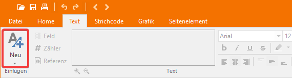 Um ein neues Text-Element hinzuzufügen, müssen Sie den Text-Einfügemodus starten, indem Sie auf der Registerkarte Home oder auf der Registerkarte Text auf die entsprechende Schaltfläche klicken und mit der Maus den neuen Textbereich auf ein Etikett zeichnen.