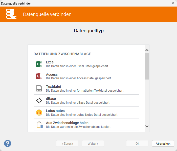 Klicken Sie auf die Schaltfläche Datenquelle, um dieses Fenster zu schließen und den Datenquellen-Verbindungsassistent zu starten.