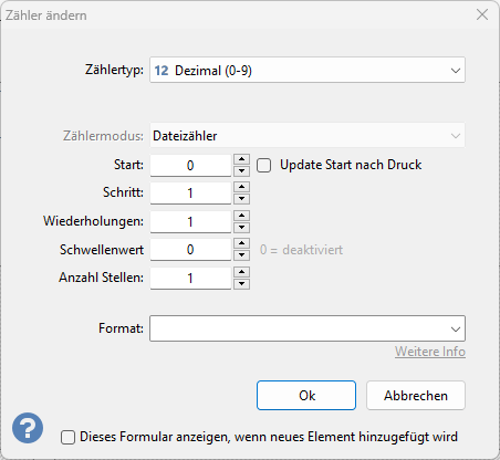 Wird die Option Dieses Formular beim Hinzufügen anzeigen, wenn neues Elemente hinzugefügt wird aktiviert, wird dieses Fenster automatisch geöffnet, nachdem ein neuer Zähler zum Text hinzugefügt wurde.