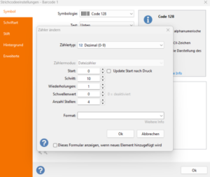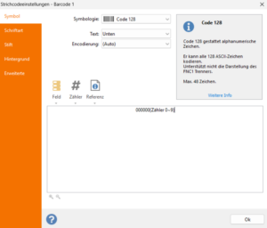 2) In diesem Fall wurden ein fixer Teil (00000) und ein dynamischer Teil durch Klicken auf das Zählersymbol eingefügt.