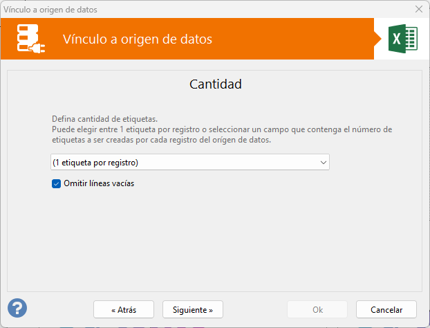 Deje la configuración por defecto 1 etiqueta por registro para crear una única etiqueta para cada registro de la fuente de datos.