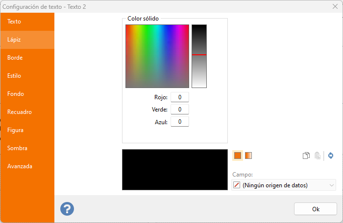 Cuando Labeljoy no puede convertir el valor leído de la fuente de datos a un color válido, usará el color predeterminado definido en el menú correspondiente (o pestaña de color en las ventanas del editor).