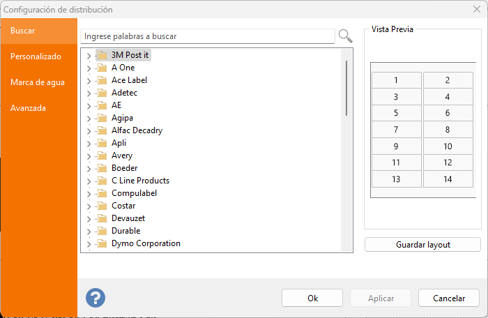 La primera pestaña le permite seleccionar un layout desde la biblioteca interna de layouts de Labeljoy, la cual incluye etiquetas de las principales marcas como así también sus layouts personalizados, siempre visibles en la categoría Personalizado.