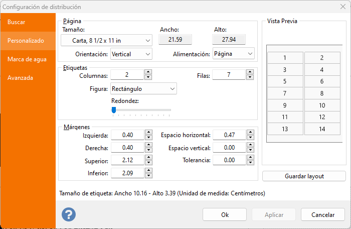 - Etiqueta: en este cuadro puede definir el layout de página, es decir la cantidad total de filas y columnas presentes en cada hoja de papel. También puede definir la forma de etiqueta.