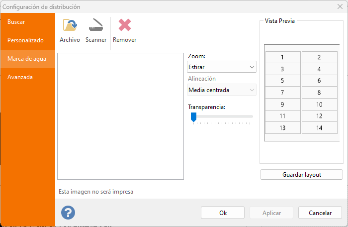 La pestaña Watermark permite cargar una imagen que será mostrada en la pantalla solamente, detrás de todos los elementos.