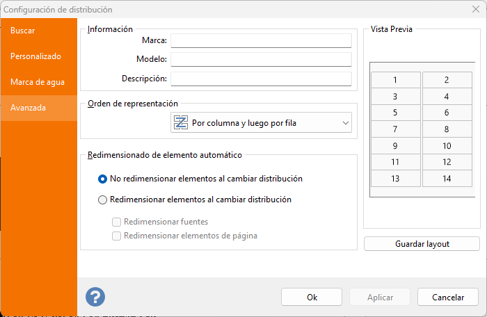 La pestaña Avanzada permite definir información adicional sobre la marca, modelo y descripción del layout actual. Tenga en cuenta que el texto definido en el campo Modelo se mostrará en la barra de estado.