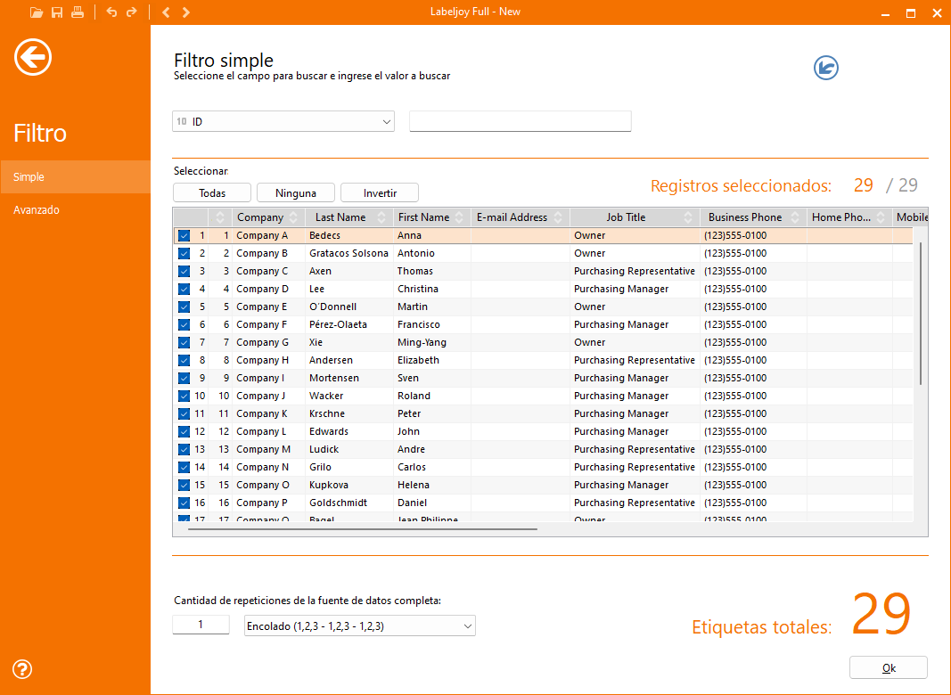 Por ejemplo, suponga que ha vinculado el conjunto a una tabla de la lista que contiene el campo apellido, y desea usar los apellidos que contengan “SA”. Seleccione Filtro simple, seleccione el campo apellido e ingrese las letras SA. La lista de registros será filtrada de acuerdo a estos parámetros y mostrará sólo los registros que contienen la condición definida, tales como, por ejemplo,  SAnchez, SalvareSA MonSAnto. Al forzar un filtro modificará la cantidad de etiquetas que serán mostradas en pantalla e impresas.