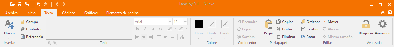 El grupo Insertar sólo muestra el botón Nuevo que es usado para ingresar el modo de agregado de texto. Al hacer clic en este botón, se muestra una lista de elementos predefinidos de uso frecuente. Dependiendo de las configuraciones en Opciones/Avanzado, presionando este botón podrá ser requerido dibujar un rectángulo con el mouse en la posición en que desea que aparezca el nuevo elemento o un nuevo elemento de texto aparecerá automáticamente.