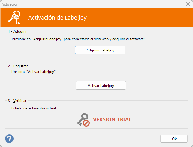 En tanto no se provea un código de activación válido Labeljoy se ejecutará en modo Trial.