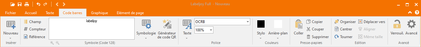 Le groupe Insérer affiche uniquement le bouton Nouveau qui est utilisé pour entrer en mode d'ajout de code barres. En cliquant sur ce bouton, une liste d'éléments prédéfinis et couramment utilisés s'affiche. Selon les paramètres définis dans Option / Avancé, en cliquant sur ce bouton, vous devrez soit dessiner un rectangle avec la souris à l'endroit où vous souhaitez que le nouvel élément apparaisse, soit un nouvel élément de code barres apparaîtra automatiquement.