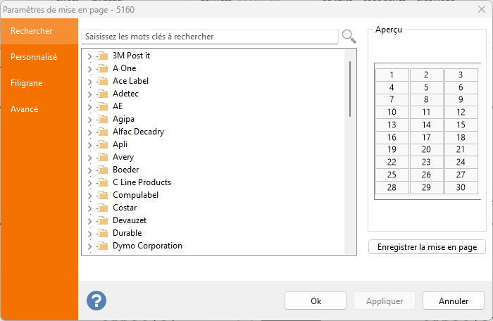 Le premier onglet vous permet de sélectionner une mise en page dans la bibliothèque de mises en page internes de Labeljoy, qui comprend les marques d'étiquettes les plus utilisées ainsi que vos mises en page personnalisées, toujours affichées dans la catégorie supérieure Personnalisé.