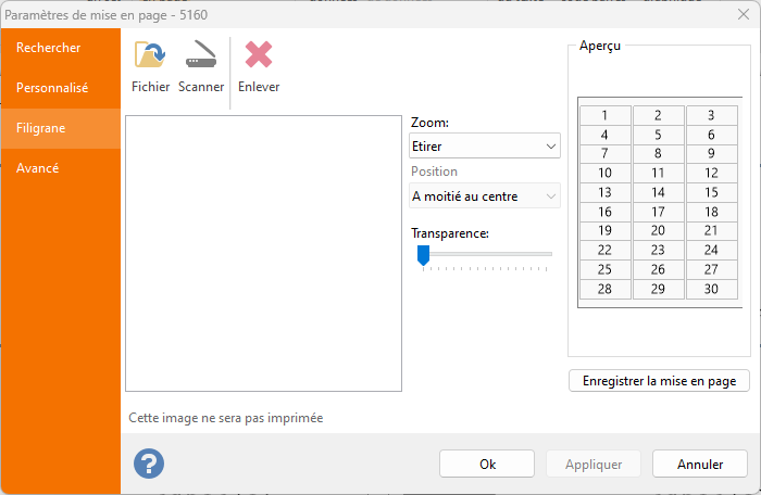 L'image chargée ici ne sera pas imprimée. Son seul objectif est de faciliter la création de modèles d'étiquettes à utiliser lorsque vous devez imprimer sur des formulaires préimprimés. |