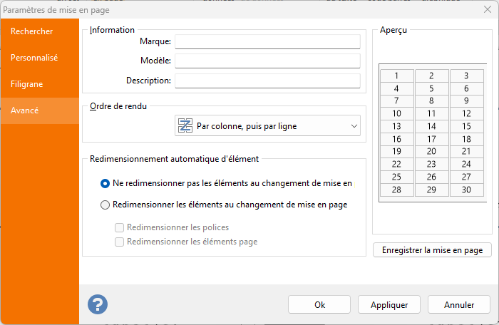 L'onglet Avancé vous permet de définir des informations supplémentaires sur la marque, le modèle et une description de la mise en page actuelle. Notez que le texte défini dans le champ Modèle sera affiché dans la