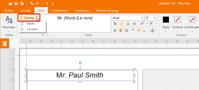 Dans les éléments de type Code à barres et Texte , vous pouvez concaténer le texte avec un ou plusieurs champs appartenant à la source de données: