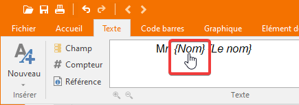 Les champs ajoutés au texte seront délimités par des accolades. En cliquant sur les liens actifs, une fenêtre contextuelle s'affiche pour vous permettre de définir des propriétés supplémentaires. |