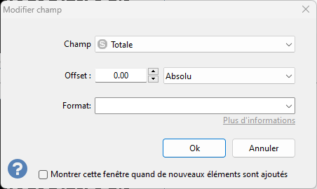 L'option Montrer cette fenêtre quand de nouveaux éléments sont ajoutés, si activée, fera automatiquement apparaître cette fenêtre juste après l'ajout d'un nouveau champ au texte. Remarque : |