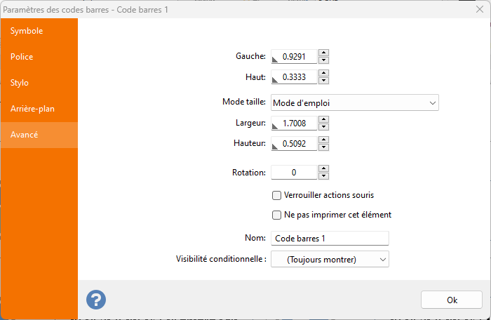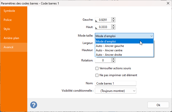 L'onglet Avancé d'un élément de code à barres contient les commandes qui vous permettent de saisir les coordonnées, la taille, la rotation et le nom. Voir les coordonnées des éléments de sujet pour plus d'informations. Il diffère des autres éléments car il contient une zone de liste déroulante Mode taille qui vous permet de définir un dimensionnement automatique pour les éléments de code-barres connectés aux données.