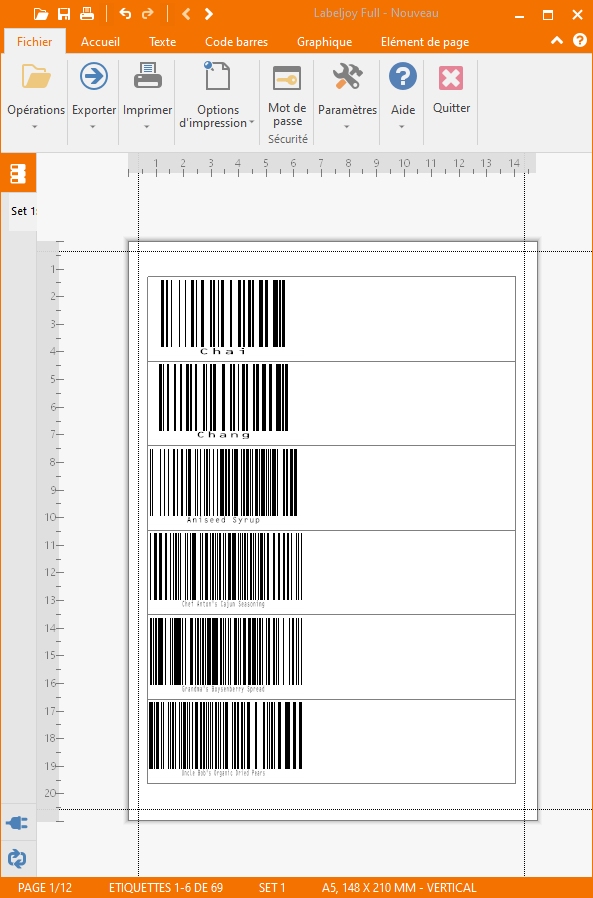Voici un exemple d'un élément de code-barres (Code 128) avec le mode de taille automatique (Ancre à gauche) et connecté à une source de données contenant des données d'adresse : Même s'il s'agit du même élément de code-barres, sa taille varie en fonction des données dont il a besoin pour encoder.