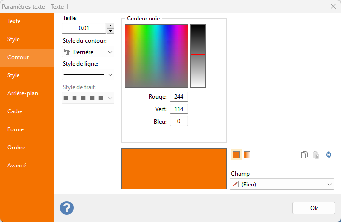 Contour : définissez la taille sur une valeur supérieure à zéro pour activer les contrôles de définition du contour. Dans ce cas, le texte est dessiné avec une couleur de contour autour des bords. Il est également possible de définir la taille du contour et le style de contour (DerrièreVide et Avant).
