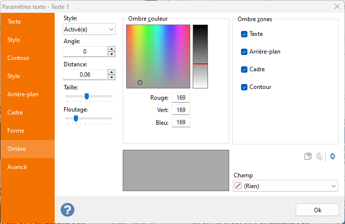 • Style : sélectionnez Activé pour déposer une ombre sur votre objet texte.