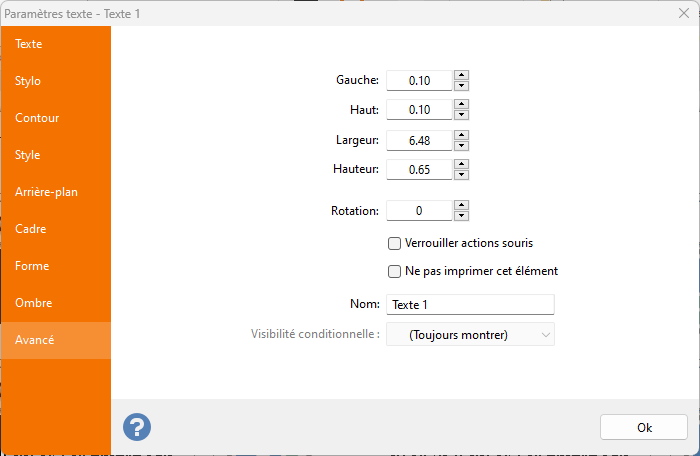 Avancé: onglet commun à tous les éléments qui vous permet de définir les coordonnées des éléments, la rotation, l'action de la souris et le nom.