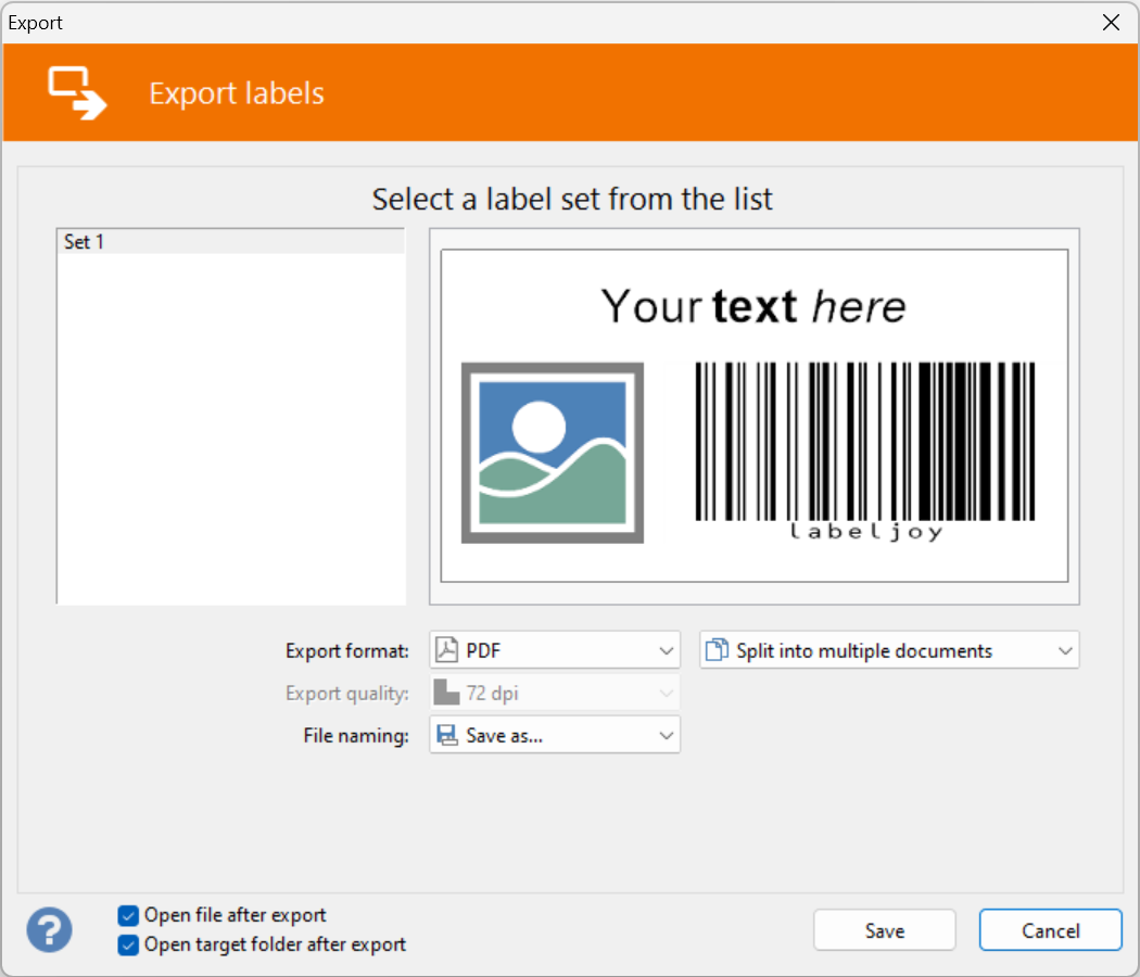• File naming: enables you to select a field from the data source (when present) to define the name of each file that is generated during export. This field is active only when Labeljoy detects that automatic naming is possible.