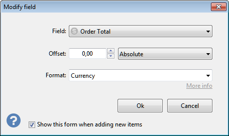 • Offset: enables you to apply an offset to numeric and date fields, acting on the value read from the data source and applying the specified offset.