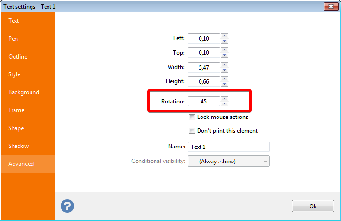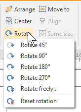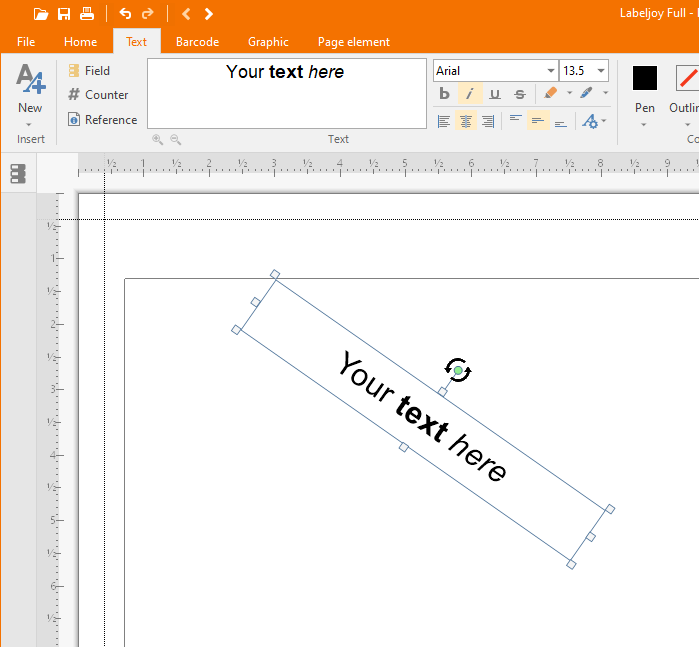 All elements placed on the page, both label elements and page elements, can be freely rotated by an angle between 0° and 359.9° degrees.