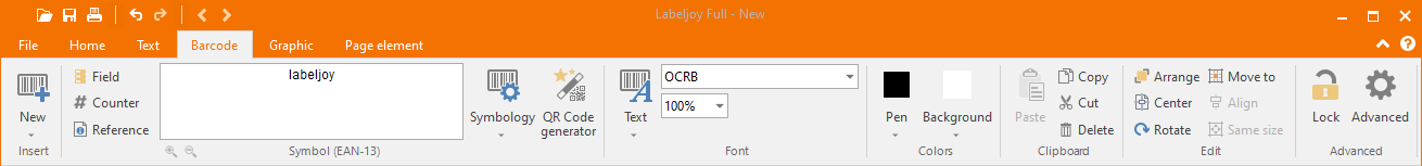 The Insert group only shows the New button which is used to enter barcode add mode. By clicking it, a list of predefined, commonly used elements is shown.