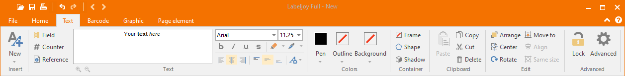 The Insert group only shows the New button which is used to enter text add mode. By clicking it, a list of predefined, commonly used elements is shown.