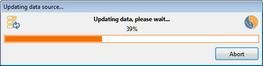 In case you checked Update data when this file is loaded or printed (in the Data source tab of the Set properties dialog box), data update will take place automatically immediately after the file is loaded and before it's printed or exported. A progress dialog box will be shown, and it will be possible to cancel the updating operation if needed.
