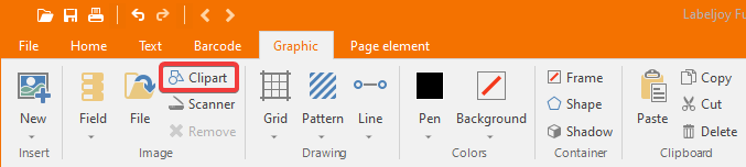 Labeljoy comes with a 4,500 clipart library, ready to be added to labels. Cliparts can be used in Graphic elements or Page elements.