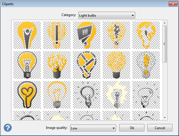 Labeljoy's clipart is on-line and the first time this window is opened, the list of thumbnails is downloaded and cached locally, every time a new category is selected.