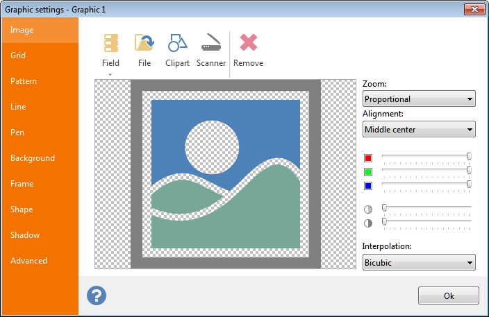 Alignment: combo box to define the alignment of the image inside its layout rectangle. This option gets deactivated in case zoom mode is set to Stretch. RGB settings: 5 controls are present that enable you to control RGB attributes: