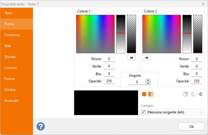 I valori validi per i membri RGBA sono compresi tra 0 e 255 e i valori validi per l'elemento Angolo sono compresi tra 0 e 359. Ad esempio: un valore valido è 128,255,48,96,80,96,50,220,90 che istruisce Labeljoy di creare il colore 1 con R = 128, G = 255, B = 48, Alpha 96, il colore 2 con R = 80, G = 96, B = 50, Alpha = 220; i colori vengono sfumati con un angolo di 90 gradi.