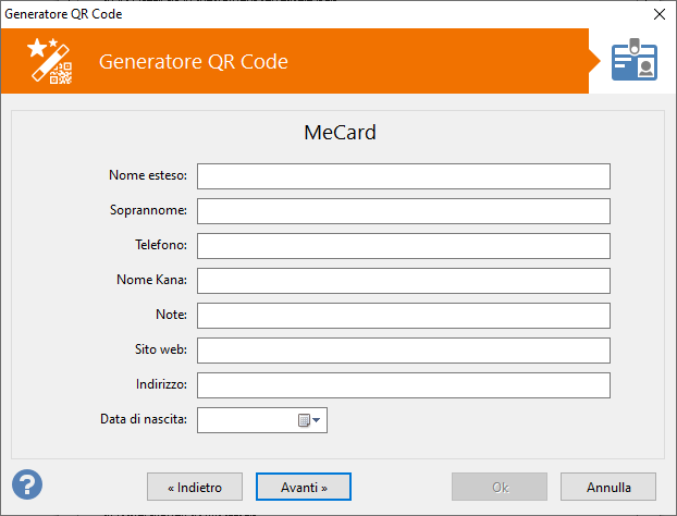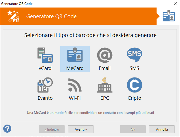 - MeCard: Codifica una MeCard includendo un set di dati semplificato per l'interscambio di informazioni personali.