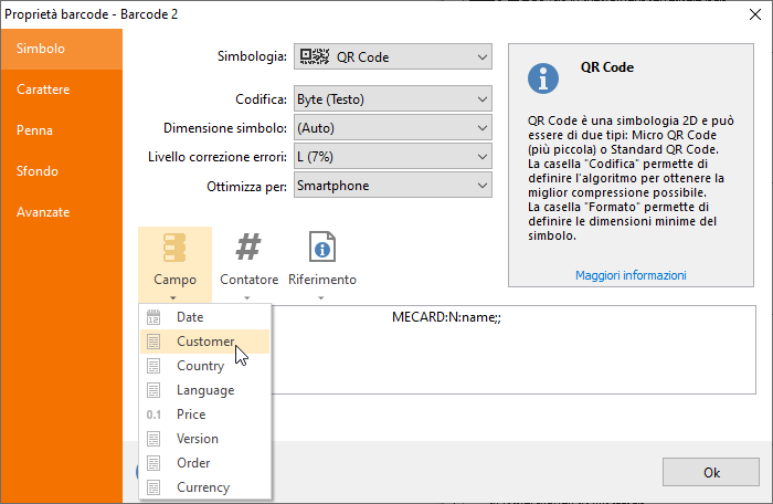 Dopo la generazione del QR code, sarà possibile modificarne liberamente la simbologia utilizzata per codificare le informazioni ma non tutte le simbologie supporteranno i dati codificati.
