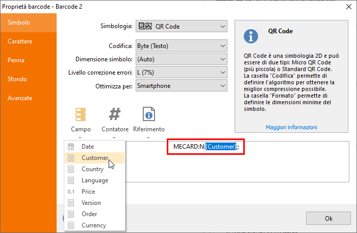 Selezionare un campo dalla lista oppure un contatore o un riferimento per sostituire il testo statico. Cliccare Ok quando terminato. Ciò farà in modo che il vostro QR code cambi dinamicamente il suo contenuto in base alla sorgente dati ed alla posizione sull'etichetta. |