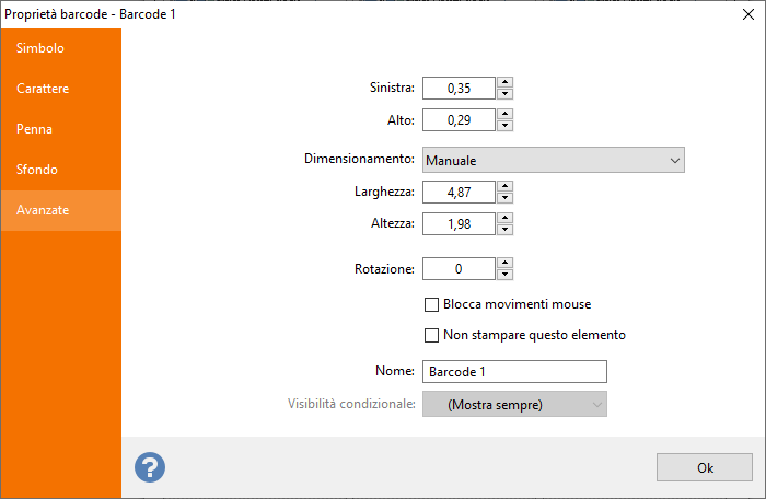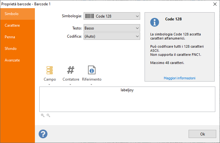 A seconda del tipo di codice a barre selezionato, Labeljoy richiede l'inserimento di alcuni parametri aggiuntivi per generare correttamente il simbolo del codice a barre. |
