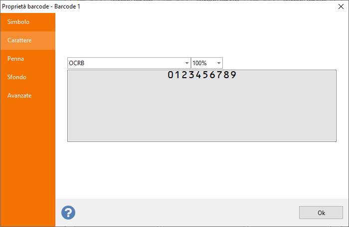 Carattere: Scheda per selezionare il carattere da utilizzare per generare il testo facoltativo sotto o sopra i simboli di codici a barre lineari.