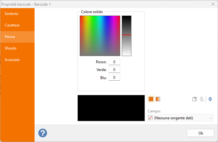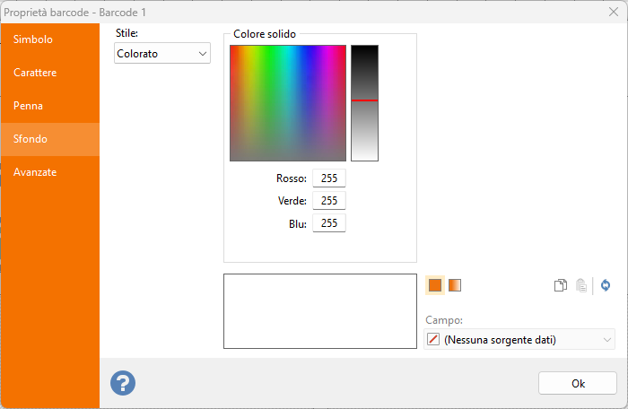 Sfondo: scheda per la definizione del colore di sfondo del codice a barre.