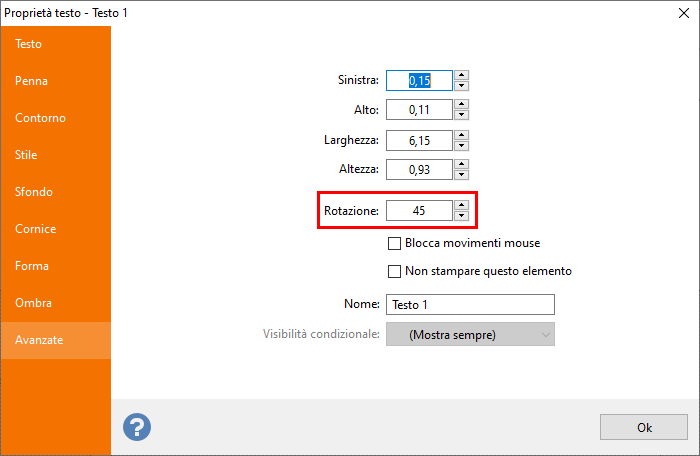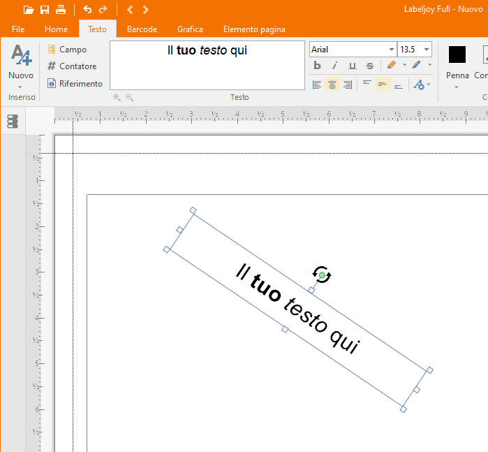 Tutti gli elementi posizionati sulla pagina, sia gli elementi dell'etichetta che gli elementi pagina, possono essere liberamente ruotati di un angolo compreso tra 0° e 359,9° gradi.