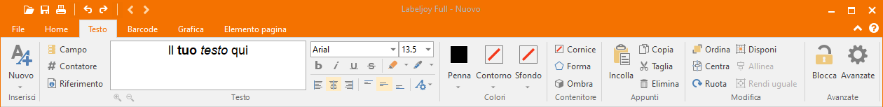 Il gruppo Inserisci mostra solo il pulsante Nuovo che viene utilizzato per accedere alla modalità di aggiunta del testo. Cliccandolo, viene visualizzata una lista di elementi testo predefiniti comunemente utilizzati.